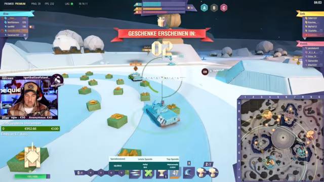 Der World of Tanks-Spielverlauf konzentriert sich auf den Winterüberfall-Modus, in dem Spieler Geschenke sammeln und strategische Kämpfe austragen. Anfängliche Verwirrung über die Spielmechaniken weicht koordiniertem Vorgehen. Parallel dazu überschreitet eine Charity-Aktion wichtige Spendenmarken, getragen von der Großzügigkeit der Unterstützer. Diskussionen über Panzer-Strategien und Spiel-Design begleiten die Runden. [World of Tanks]