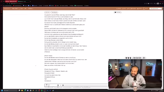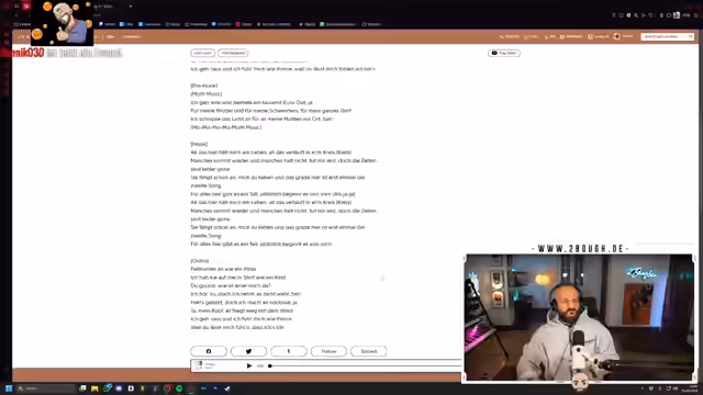 00:09:41Die ersten Tracks des Albums 'Souly' werden intensiv analysiert. Der Streamer stellt fest, dass der Sound künstlerischer und weniger '0815' ist. Die Produktion von 'Oxygen' wird als 'wunderschön' und 'warm' gelobt. Die Texte der ersten beiden Songs 'Oxygen' und 'Song 2' werden im Detail ausgelegt, wobei das zentrale Thema 'Kreislauf' im Leben und Beziehungen identifiziert wird. Der Streamer sieht deutliche Anleihen bei der Maybach Music und fühlt sich durch die tiefgründigen Texte an einen Deutschuntericht erinnert.