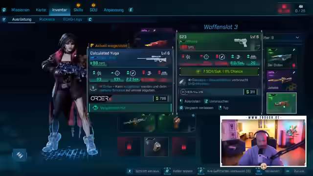 01:07:52Der Streamer erkundet die Welt von Borderlands, wobei er sich zunächst mit Schnellreisemöglichkeiten auseinandersetzt, die noch nicht freigeschaltet sind. Er entdeckt das SDU-System, mit dem die Munitions- und Speicherkapazität des Charakters verbessert werden kann. Es folgt ein ausführlicher Prozess des Waffenvergleichs und der Bewertung, um unbrauchbare Waffen zu identifizieren und zu markieren. Dabei werden verschiedene Waffentypen wie Sturmgewehre, MPs und Scharfschützengewehre berücksichtigt. Der Streamer verwirft minderwertige Waffen und priorisiert den Besitz einer Shotgun. Er analysiert Schilde und deren Regenerationseigenschaften, wobei er feststellt, dass einige gefundene Schilde schlechter sind als sein aktuelles Equipment. Heilgegenstände werden ebenfalls kurz betrachtet. Der Prozess des Aussortierens und Verkaufens von Waffen wird demonstriert, wobei ein System genutzt wird, um markierte Items schnell zu verkaufen.