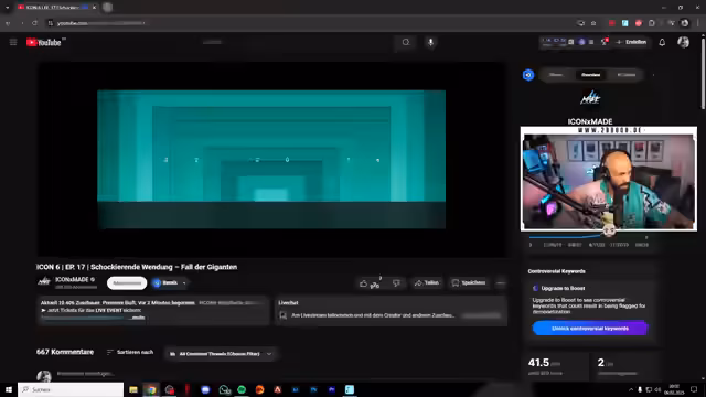 01:51:17Nach dem Ende der RLR 2-Folge und der emotionalen Verabschiedung von Leo und Serco geht der Stream in eine neue über. Es beginnt die Reaktion auf die sechste Staffel des Formats Icon. Der Streamer gibt einen Ausblick auf zukünftige Gäste und Streams. Die erste Reaktion behandelt eine Folge, in der es ein sogenannter 'Fall der Giganten' stattfindet. Im Zuge dessen urteilt die Jury über einen Auftritt von Mufasa und Dino und entscheidet sich letztendlich für Mufasa als Sieger, was zu einer Änderung in der Rollenverteilung im Format führt.