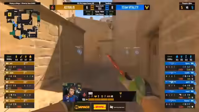 01:33:29In der ersten Pistolround gelang Vitality ein Double Headshot mit der USP, was ihnen eine Überzahl brachte. Astralis hatte Schwierigkeiten mit der Verteidigung und verlor die Runde knapp. Die Rundenverteilung war bis zur Halbzeit ausgeglichen, wobei Vitality einen Timeout nahm, um die Taktik anzupassen. Die Map war sehr eng und von strategischen Entscheidungen geprägt.