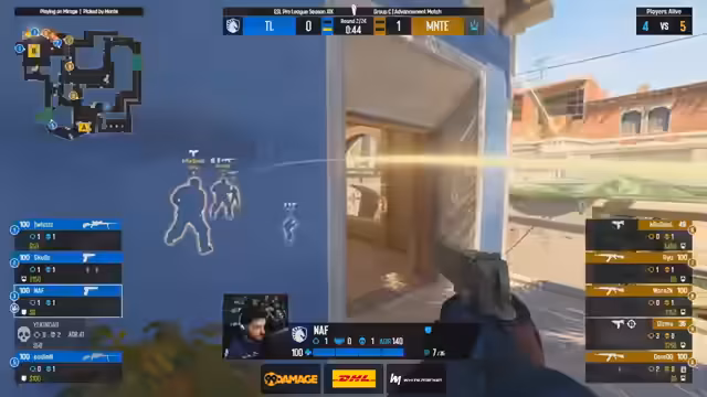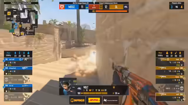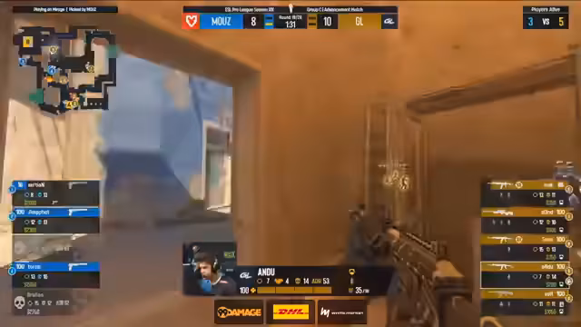 00:55:37Auf dem eigenen Map-Pick Mirage startet MOUZ wieder stark mit einer gewonnenen Pistol Round. Doch im Gegensatz zu Nuke zeigt GamerLegion mehr Widerstand und kann einige Runden gewinnen. Die erste Hälfte endet mit 7:6 für MOUZ, was einem klaren Unterschied zur ersten Map entspricht. GamerLegion zeigt mehr Kampfgeist und kann einige Waffenrunden für sich entscheiden, während Exertion für MOUZ als Entry-Fighter glänzt.