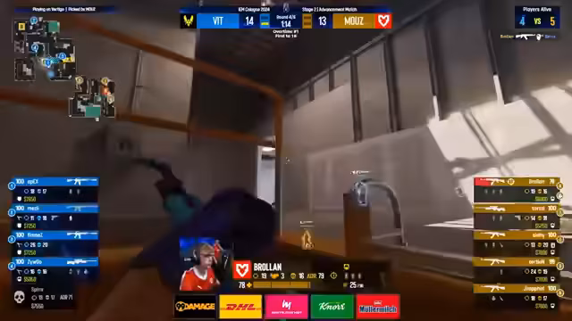01:36:11MouZ holt den Ausgleich und liegt 5-5 vorne. Der Ausgleich resultiert aus präzisen Midround-Calls von Shui, der das Team flexibel auf die A-Seite umorientiert. Vitality agiert weiter sehr individuell, besonders Spinks, Messi und Zyru dominieren durch ihr Aim. MouZ nutzt die koordinierten Angriffe und das starke Teamplay aus, während Vitality zu sehr in Einzelaktionen verfällt. Die konsequente Umsetzung des T-Plans führt zu einem klaren Vorteil für MouZ in der Halbzeit.