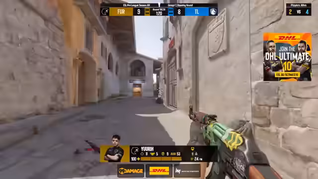 01:55:24Auf dem Map-Pick von Furia, Mirage, geht es in die heiße Schlussphase des zweiten Halbstücks. Team Liquid hat mit 7:5 geführt, doch Furia kämpft sich bis auf ein 5:5 heran. Die Spannung ist hoch, da es um den wichtigen ersten Sieg im Best-of-One geht. Beide Teams kämpfen aggressiv, nutzen Fallen und Umläufe, um sich im engen Spiel zum Vorteil zu bringen. Cadian von Furia ist in diesem Match-up sehr aktiv, während Team Liquid auf die Routinen seines IGLs Juri setzt. Das Ergebnis hängt von der nächsten Runde ab.