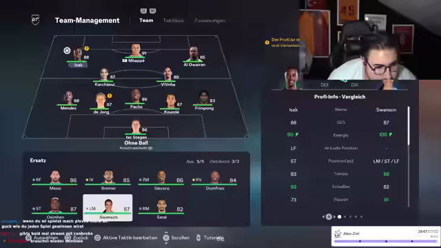 04:46:50Der Streamer bittet den Chat, den Abo-Chat zu aktivieren, da er sehr wütend ist und sich nicht kontrollieren kann. Er diskutiert über mögliche Spielerwechsel und Team-Verbesserungen, wobei er überlegt, ob er eine weitere Icon-Karte ins Team holen soll. Er sucht nach einem starken Sechser für das Mittelfeld und überlegt, ob er Kundi als Rechtsverteidiger einsetzen soll. Er verwirft die Idee, Mbappé zu behalten und entscheidet sich stattdessen für ein besseres Team. Er experimentiert mit verschiedenen Aufstellungen und Spielern, um das bestmögliche Team zusammenzustellen. Er entscheidet sich für Nico Williams anstelle von Raffinia und betont, dass er noch 400k übrig hat. Abschließend lobt er Dembélé als besseren Spieler als Mbappé und bedauert, ihn verkauft zu haben. Er merkt an, dass das Team nun gut zusammengestellt ist.