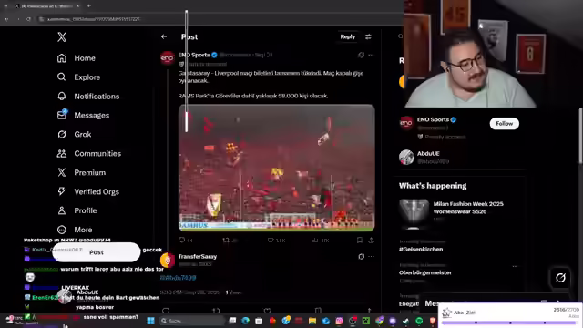 abdu9974 analysiert das Spiel Galatasaray gegen Liverpool, betont den Heimvorteil und die Fanliebe. Er diskutiert Trainer, motiviert Spieler und teilt Fitnessstudio-Anekdoten mit Singo. Spekulationen über Trainerwechsel, FIFA-Frust und Rap-Ambitionen werden ebenfalls thematisiert. Der Ausgang des Spiels wird mit Spannung erwartet.