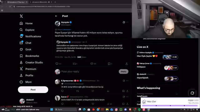 01:00:41Es entwickelt sich eine Diskussion über die spielerische Qualität von Omar Marmoush im Vergleich zu Ozan Tufan. Der Streamer ruft eine neutrale Person ins Discord, um die aktuelle Form der beiden Spieler objektiv zu vergleichen. Nachdem der Gesprächspartner zu dem Schluss kommt, dass Marmoush in der aktuellen Form besser ist, bestätigt der Streamer dies und stellt erneut die Frage, ob der Galatasaray-Vorstand den Transfer tätigen wird.