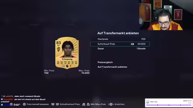 05:11:35Der Streamer kündigt an, Usman Dembélé zu kaufen und ändert den Titel des Streams entsprechend. Er bedankt sich bei Stolli für 10 Subs und bei Weylo für 2 Subs. Er sagt, dass der heutige Sponsor Tramsonspor sei und korrigiert den Namen einer Person im Chat. Er plant, FIFA Points aufzuladen, um die Community zu belohnen. Er betont, dass es nicht auf die Division ankommt, sondern darauf, was man zieht. Er kündigt an, 140 Euro aufzuladen und freut sich über einen Hunter, den er gezogen hat. Er bittet den Chat, das Istanbul United-Emote zu spammen, da er das Logo mag. Er kann sich mit dem aktuellen Tap nicht konzentrieren und bedankt sich für einzelne Subs. Er kündigt an, Packs zu öffnen und Coins zu kaufen, um Mbappé Cash zu holen. Er erwähnt, dass er die Promopacks schon zum Frühstück gegessen habe und bedankt sich für weitere Subs. Er überlegt, Dembélé zu kaufen, auch wenn er teuer ist, und möchte eine Jungfrau-Version des Spielers mit 0 Kilometern. Er sagt, er wolle FIFA Points und eine 150 Euro Karte holen. Er möchte ein Logo suchen, das wie Istanbul United aussieht, und fragt, ob es möglich ist, Istanbul United in FIFA zu integrieren. Er will Mbappé holen und keine kleinen Kuchen mehr. Er fragt, wie viel der Peach kostet, und wird provoziert, ihn zu kaufen. Er möchte nicht der neue Trimax werden und betont, dass er einen Verein und eine Einheit gegründet hat. Er fragt, wer er sei, dass er keinen Mbappé in seinem Verein habe.