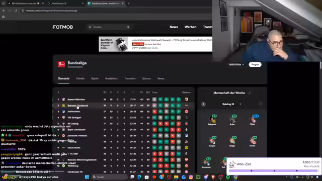 01:25:45Der Streamer analysiert die aktuelle Champions-League-Tabelle und ist verwundert, warum Galatasaray auf Platz 17 steht und Eintracht Frankfurt fehlt, was er als Anzeigefehler oder KI-Manipulation bezeichnet. Er sieht Galatasaray in einem harten Gruppenspiel mit Borussia Dortmund. Im Kontext der Bundesliga kritisiert er die Dominanz von Bayern München und prophezeit, dass ohne Bayern die Liga uninteressant wäre, während er ein mögliches Gala-Dortmund-Spiel als geisteskrank bezeichnet.