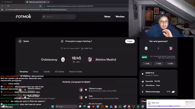 00:03:01Parallel zum Stream verfolgt der Streamer das viertelfinale der AFCON zwischen Nigeria und Marokko, insbesondere im Fokus steht der nigerianische Stürmer Ozyman. Als Ozyman im Spiel humpelt und ausgewechselt wird, bricht Panik aus. Es gibt Sorge um eine Verletzung, die Galatasaray beeinträchtigen könnte. Der Streamer ist in Kontakt mit anderen Journalisten und Experten, um Informationen einzuholen. Während des Elfmeterschießens wird gespannt mitverfolgt, ob Nigeria das Halbfinale erreicht.