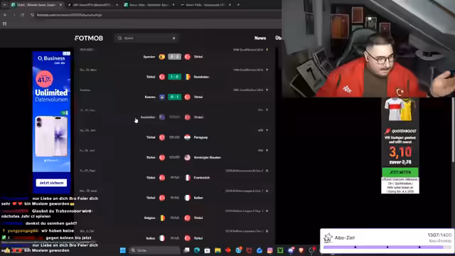 03:13:08Der Streamer begeistert sich für den großen Selbstvertrauen der türkischen Nationalmannschaft und ihres Verbandspräsidenten, der bereits das Finale und den Gewinn der Weltmeisterschaft proklamiert. Er sieht dies als positiv und sympathisch an. Er appelliert an die türkische Community in Deutschland, ihre Spieler zu unterstützen, anstatt sie kritisieren, und kündigt an, seine Aufgabe als Creator darin zu sehen, die Begeisterung für die WM zu steigern, damit um 4 oder 6 Uhr morgens ganze Straßen in Deutschland feiern.