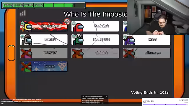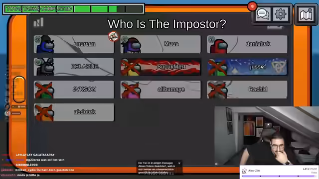 09:52:20Nachdem ein Spieler namens Ali einen weiteren Mitspieler namens Yusuf getötet hat, wird diskutiert, wer als nächster aus dem Spiel genommen werden soll. Der Streamer argumentiert, dass Ali eine extrem gute Strategie verfolgt habe, indem er Yusuf getötet habe und sich danach unauffällig verhalten habe. Es gibt unterschiedliche Meinungen, wer der nächste Impostor sein könnte und wer als nächstes vorgewählt werden soll, wobei die Diskussion sehr emotional und teilweise chaotisch verläuft.