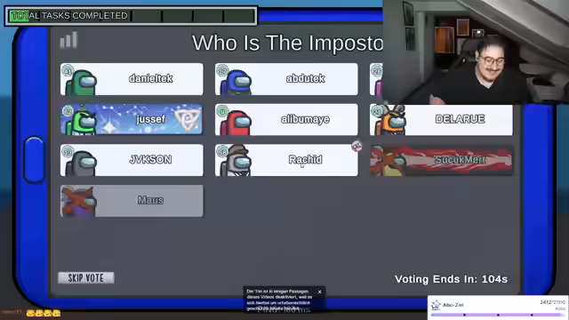 09:16:32Zu Beginn des Spiels werden mehrere Spieler als Verdächtige diskutiert, insbesondere Ali und Raschid. Der Streamer berichtet von einem Streit über das Rausvoten von Maus und wirft Raschid vor, unklar zu handeln. Es wird über Kills in der 'Lektion' diskutiert, wobei Ali für seine Leistungen gelobt wird. Die Diskussion zeigt die angespannte Atmosphäre und das Misstrauen unter den Spielern, besonders bei der Bewertung von Ali's Fähigkeiten und der Verantwortung für Verluste.