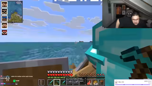 05:25:48Eine Rabattaktion wird gestartet, die 46 Stunden laufen soll, mit Sonderangeboten auf Subbomben und Dienste wie MTF. Die Werbung wird intensiv mit Wiederholungen wie 'Rabatt, Rabatt, Rabatt' verstärkt. Anschließend folgen persönliche Themen: Diskussionen über das Idealbild einer Partnerin, wobei Intelligenz und der Beruf der Steuerberaterin betont werden. Danach wechselt der Fokus auf kreative Minecraft-Projekte, darunter der Bau eines Strands aus Stein, eines Hotels namens 'Hayat Hotel' in der Nähe eines Stadions und Ideen für einen Bootsumbau einer Insel. Es werden auch Erkundungen zur Eisenfarm und Materialbeschaffung unternommen.