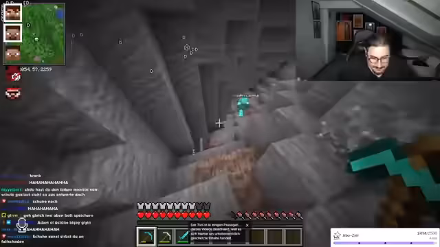 11:51:02Das Team beginnt mit der systematischen Erkundung einer tiefen Höhle, um an wertvolle Ressourcen wie Diamanten und seltene Gegenstände zu gelangen. Dabei ist die Gruppe auf stark bewachte Bereiche mit Spawndern gestoßen, die eine koordinierte Taktik erfordern. Der Streamer ist dabei sehr motiviert, ein legendäres Werkzeug, den Morgenstern, zu finden, während seine Teamkameraden in die Höhle vordringen und die Kisten und Monster bekämpfen.