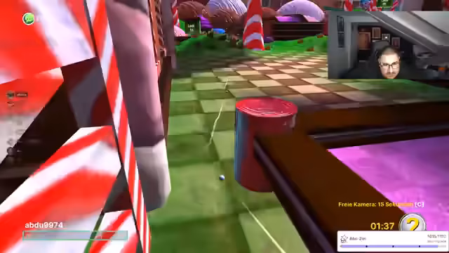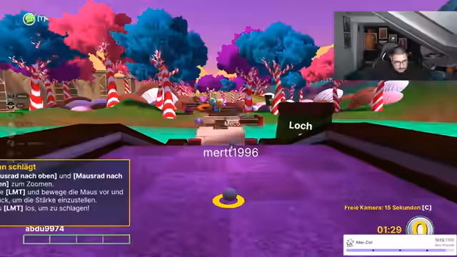 01:41:08Nach mehreren chaotischen Runden wechselt das Spiel komplett. Die Streamer beschließen, ein kooperatives Golf-Spiel zu starten, um ihre Teamfähigkeiten in einer entspannteren Umgebung zu testen. Es wird ein privater Raum mit Passwort erstellt, um exklusiv nur mit den Teamkollegen zu spielen. Die Stimmung ist nun konzentriert und positiv. Die Spieler unterstützen sich gegenseitig bei der Einschätzung von Schlägen und dem Finden des richtigen Weges zum Loch. Das Ziel ist es, gemeinsam eine gute Punktzahl zu erzielen und die Teamleistung zu verbessern.