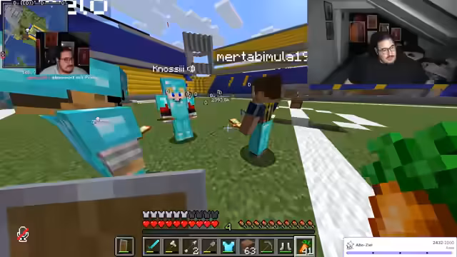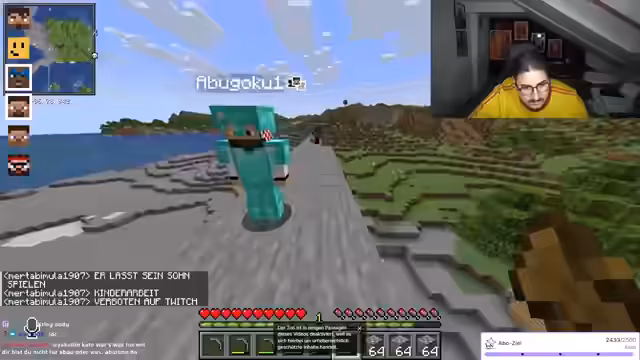 11:29:52Abdu und weitere Teilnehmer starten eine Minecraft-Session mit dem Ziel, zwei Stadien (Galatasaray und Fennerstadion) und eine Brücke zu bauen. Es entstehen Herausforderungen beim Ressourcenabbau, wie Holz- und Steingewinnung, wobei Abdu als Neuling zunächst Schwierigkeiten hat. Sie organisieren sich durch Koordinatenangaben und tauschen Werkzeuge aus, um Effizienz zu steigern. Der Fokus liegt auf dem Sammeln von Kohle, dem Bau von Werkbänken und der Herstellung von Brot als Grundnahrungsmittel, während über die halal-Konformität von Schweinefleisch in Minecraft debattiert wird.