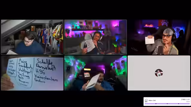 04:07:52Die Teilnehmer beginnen mit der Vorbereitung eines Fußball-Quiz-Spiels. Sie diskutieren die Spielkategorien, darunter internationale Wettbewerbe wie Welt- und Europameisterschaften sowie Top-5-Ligen. Es werden die Regeln festgelegt: Pro Liga müssen fünf Vereine genannt werden, wobei die Reihenfolge egal ist und jeder korrekte Verein einen Punkt bringt. Die Gruppe plant, die Kategorien systematisch abzuarbeiten und beginnt mit der spanischen La Liga.