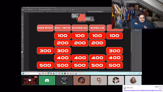 04:49:24Das Quiz wird fortgesetzt und die Fragen werden anspruchsvoller. Teilnehmer müssen nun den Marktwert von Spielern wie Gavi, Frimpong und Vlahovic einschätzen und platzieren. Dabei kommt es zu einigen falschen Tipps und Verwirrungen, zum Beispiel bei der Position von Spielern wie Gavi und Musiala. Der Teilnehmer Maus macht einen falschen Tipp und ist damit ausgeschieden. Der Ton des Streams bleibt trotz der Schwierigkeiten locker und teilweise vulgär.