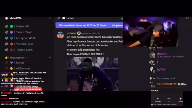 05:30:15Es wird über FIFA-Gameplay gesprochen, einschließlich Taktiken und Spielerbewertungen. Es geht um die Leistung einzelner Spieler wie Lorente und Rodrigo, wobei der Wunsch geäußert wird, Rodrigo zu verkaufen. Es wird über die Möglichkeit diskutiert, dass ein Spieler namens Kretsch eine Vorlage liefert. Die Frage wird aufgeworfen, was ein "Nutt" in diesem Kontext bedeutet. Der Chat wird nach Meinungen gefragt, wie der türkische Fußball wieder zu Ansehen gelangen kann, wobei Gala's Spiel gegen Liverpool als möglicher Faktor genannt wird. Es wird über Shareplay und Stream-Sniping diskutiert, wobei der Streamer droht, Stream-Sniper zu moderieren. Der Streamer spricht über seine Arbeit und wie er durch das Streaming Geld verdient. Es wird über Spieler wie Pina diskutiert, wobei der Streamer andeutet, dass er durch das Streaming Geld verdient und sogar Screenshots seiner Einnahmen posten wird. Es wird über die Leistung von Spielern wie Rafinha diskutiert und darüber, dass das Spiel den Streamer "fickt". Der Kauf eines brasilianischen Trainers wird in Erwägung gezogen, und es wird festgestellt, dass das Team "gefickt" ist. Es wird überlegt, wie man Spieler auf Chemie bringen kann, und die Bedeutung von Carpagina wird hervorgehoben. Der Streamer bedankt sich bei einem Zuschauer für eine Spende und spricht über Stream-Sniping und Werbung.