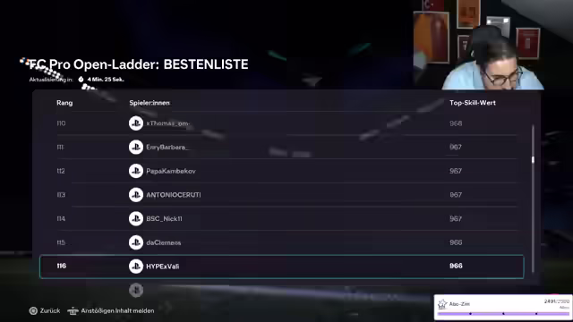 07:25:19Der Streamer berichtet von frustrierenden Erfahrungen im Spiel, insbesondere von einem Gegner, der durch exzessives Dribbeln Zeit verschwendet. Er teilt auch seine Erfahrungen in Division 6 und äußert seinen Unmut darüber, wenn Gegner durch Konterangriffe punkten. Es wird diskutiert, ob man ab Division 6 absteigen kann, und der Streamer sucht Bestätigung im Chat. Er erwähnt, dass er eine Zeit lang nicht aktiv war und sich erst wieder ins Spiel finden muss. Trotzdem betont er, dass ihm das Spiel wieder Spaß macht. Er beendet eine Partie und bedankt sich bei den Zuschauern, die dabei waren. Der Streamer beschreibt, wie er unnötig Spiele verloren hat und wie frustrierend es ist, wenn Gegner das Spiel verlassen. Er spricht auch über die Bedeutung eines gemeinsamen Hype Trains und die Vorteile von Prime-Abonnements für die Zuschauer.