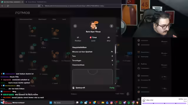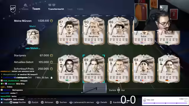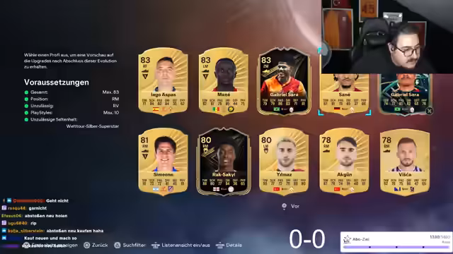 06:19:33Der Streamer offenbart seine frühere FIFA-Sucht, die ihn von seinem 20. bis 24. Lebensjahr fest im Griff hatte. Er beschreibt sich als 'FIFA-Junkie', der täglich 16 bis 18 Stunden spielte und dadurch viele Fehler machte, darunter soziale Isolation und das Verpassen wichtiger Ereignisse. Er kündigt an, für die bevorstehende Weekend League seinen alten, 'süchtigen' Spielstil wieder hervorholen zu wollen, um zu beweisen, wie gut er eigentlich ist und dass er normalerweise auf einem niedrigeren Niveau spielt, um seine Gesundheit zu schützen. Er möchte zeigen, dass er damals jeden E-Sportler 'gegen die Wand geklatscht' hat und plant, diesen 'Abde-Ü' (seinen alten Spielstil) noch einmal zurückzuholen. Er sucht nach einem Stürmer für eine Million Coins und überlegt, wie er schnell 200.000 Coins generieren kann, um Emilio Butragueno zu kaufen.