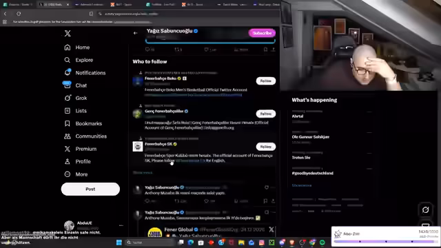00:03:01Der Stream beginnt mit traditionellen türkischen Willkommensgrüßen wie Salam aleikum an die Zuschauer. Der Streamer berichtet, dass er sich das Spiel von Fernbahçe angesehen hat und über seine Freude über den 2:0-Sieg gegen Samsunspor spricht. Er hebt besonders die Leistung von Musaba als Man of the Match hervor und äußert seine Freude, dass dieses Ergebnis das angestrebte Finale gegen Galatasaray ermöglicht, was ein spannendes Derby verspricht.