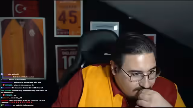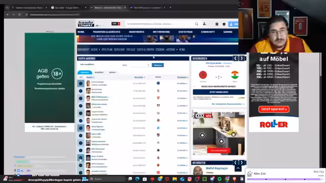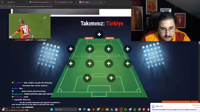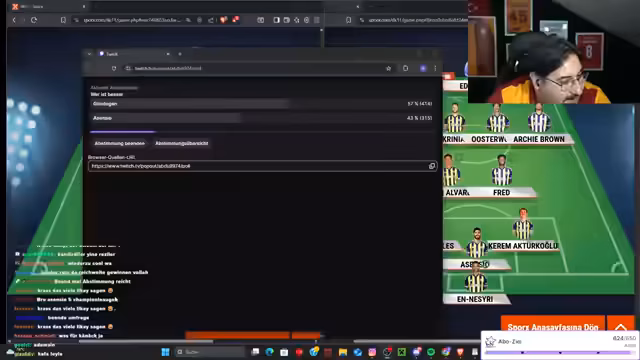 01:26:56Der Stream beginnt mit der interaktiven Erstellung eines Dreamteams für Galatasaray. Der Streamer bittet die Community, per Abstimmung die Positionen zu besetzen. Nachdem sich die Zuschauer für Ederson im Tor mit 70% aussprechen, folgt eine hitzige Debatte um die Rechtsverteidigerposition. Semedo erhält mit 73% der Stimmen den Vorzug, während der Streamer über angebliche Objektivitätsprobleme und Ragebait seitens des Chats klagt. Auch für die Innenverteidigung wird eine Abstimmung durchgeführt, bei der Namen wie Aib, Singo und Osterwola diskutiert werden, wobei der Streamer die Ergebnisse teilweise für "Eib" (türkisch für Betrug) hält.