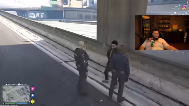 00:50:42Der Streamer steigt ins Roleplay (RP) ein und beginnt eine Streife mit seinem Kollegen Duanga Kalinka Fufuna und Ananasas, dessen Spitzname Smudo Rindenberg ist. Sie sind als Polizisten unterwegs und erleben skurrile Situationen. Bei einer Fahrzeugkontrolle fordern sie die Insassen auf, sich komplett nackt zu machen, um versteckte Gegenstände auszuschließen. Später nehmen sie einen Mann fest, der sie angeblich gefilmt hat, und Duanga liest ihm die Rechte vor, allerdings in einer sehr unkonventionellen und humorvollen Weise. Die Streife führt zu weiteren absurden Begegnungen, darunter eine Diskussion über die Mutter des Streamers, die angeblich auf der Straße mit Hundefutter erstickt ist. Die Interaktionen sind von viel Humor und improvisierten Dialogen geprägt, die die Unterhaltung im RP in den Vordergrund stellen.