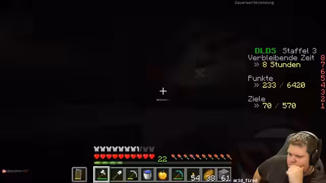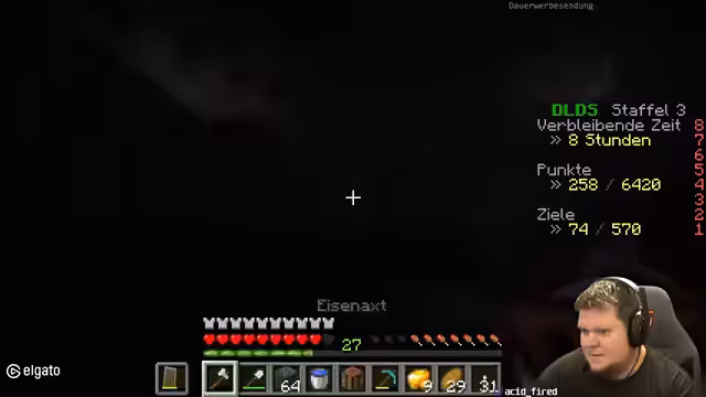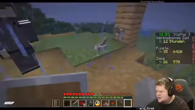 11:47:49Die geplante Aktion, mit Lava und Obsidian einen violetten Stein herzustellen, wird durch eine plötzliche technische Unterbrechung zunichtegemacht. Der Streamer verliert kurz die Internetverbindung, was sofortige und ernsthafte Konsequenzen nach sich ziehen könnte. Er äußert große Besorgnis über den möglichen Spielverlust, da er in einer kritischen Situation war und wichtige Objekte oder Positionen nicht mehr erreichen kann. Dies unterstreicht die prekäre Natur des Hardcore-Spiels und die frustrierende Verbindung von Spiel und Technik.