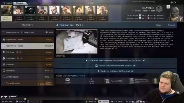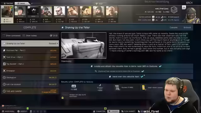 00:54:03Nach einer erfolgreichen Runde mit mehreren erbeuteten Gegenständen, darunter wertvolle wie ein M700 und ein Headset, diskutiert der Streamer die aktuellen Quests. Er spricht über die Quest 'Rituals of the Great Circle' und den Aufenthaltsort des benötigten Buches. Die Drops aus dem Twitch-Event werden gesammelt und ein Case Opening durchgeführt, bei dem seltene Gegenstände gewonnen werden. Die Diskussion um die neuen und bestehenden Quests wie 'Population Census' und die generelle Inflation von Loot durch die Drops wird fortgeführt.