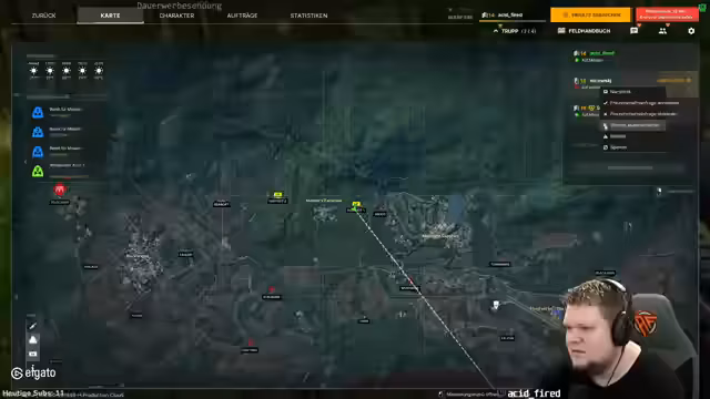 04:40:11Der Streamer beschreibt die auf der Karte sichtbaren PvP-Kämpfe und das Einnehmen von Außenposten. Er erklärt, dass das Spiel mit den Quests weitergeht, aber auch das Erobern von roten Punkten (Bases) möglich ist. Diese dienen als Outposts, um Items zu lagern und an Händlern zu verkaufen. Er berichtet von einem erfolgreichen PvP-Gegner und davon, dass die Karte nun die Lage von Spielerkontrollierten Gebieten anzeigt. Er hebt hervor, dass er durch das Freischalten der LZs mobil ist und sich nun flexibler über die Karte bewegen kann.