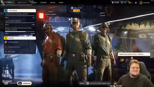 04:12:14Nach dem erfolgreichen Abschluss der Mission und dem Finden wertvoller Gegenstände, darunter eine Waffe, die den Reaktor der 'Queen' benötigt, wird über die Spielmechaniken und zukünftige Pläne gesprochen. Es wird die Möglichkeit erörtert, einen blauen Schild beim Trader zu kaufen, um mehr Aufladungen zu erhalten. Die Spieler planen, ein 'Felddepot' zu besuchen, um eine weitere Quest zu erledigen, bei der eine Batterie eingesetzt werden muss. Es wird über die Schwierigkeit gesprochen, diese Batterie zu finden, und die Umgebung wird danach abgesucht. Ein 'entzündende Schneekugel' und eine 'edle Armbanduhr' werden gefunden, was die Runde zu einer 'absolut heftigen Runde, was Loot angeht' macht. Die Spieler sind zufrieden mit dem Fortschritt und der Menge an gefundenen Gegenständen.