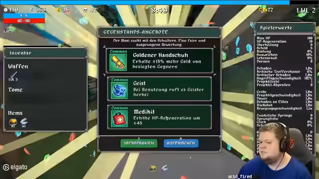 08:31:11Der Streamer startet einen neuen Run mit einer veränderten Strategie. Diesmal werden die Erkenntnisse aus dem vorherigen Scheitern direkt umgesetzt. Man versucht, von Anfang an die richtigen Aufwertungen und Items zu finden, um besser für die kommenden Bosse gewappnet zu sein und nicht erneut an der fehlenden 'Käse' zu scheitern.