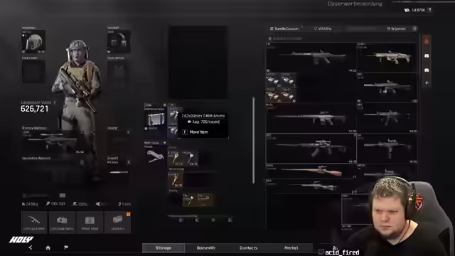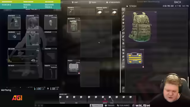 05:03:34Es läuft gut im Spiel, mit mehreren "Reds" in kurzer Zeit, was für Veli ungewöhnlich ist. Es gibt jedoch Probleme beim Zusammenbauen von Gegenständen, die im Stash landen, anstatt ausgerüstet zu werden. Versehentlich werden auch Items aus vorherigen Runden mitgenommen, was den Stash unübersichtlich macht. Es wird überlegt, das Gebiet zu wechseln, da es bereits spät ist. Die Entscheidung fällt auf Northridge, da die Zeit drängt. Diskussionen über die Ausrüstung für die nächste Runde, inklusive Stimulanzen und Energy-Drinks, um die Ausdauer zu erhöhen, finden statt.
