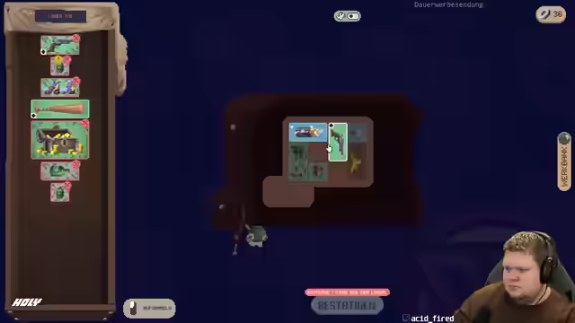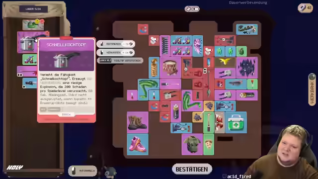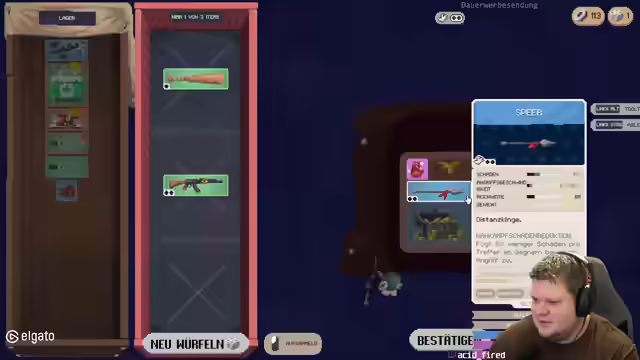 01:12:14Der Streamer bedankt sich für Resubs und ist von der Action und den Kombinationsmöglichkeiten im Spiel begeistert. Er sucht nach einem Robo-Arm, um Handfrei zu sein, erhält aber Schaden. Es wird versucht, die Map fertigzustellen. Der Streamer ist unsicher, ob er die Schatzkiste wegen der Void nehmen soll. Er baut einen Reservespeer und versucht, zwei Sprints mehr zu bekommen. Ein Damage-Boost wird erzielt, und der Run wird nachhaltig verändert. Es wird versucht, das Ding irgendwie ranzutüdeln, und der Schaden wird optimiert. Der Streamer bedauert, den Repeater nicht mitgenommen zu haben. Er hat kein Geld für Upgrades. Das Spiel lagt, wird aber als cool empfunden. Der Speer ist sehr groß. Es wird überlegt, einen Magneto zu nehmen. Beim Einsammeln von Items sollen Blitze ausgelöst werden. Es wird versucht, die Bananen mitzutriggern, um Bananen regnen zu lassen. Das Hauptproblem ist, dass die Schuhe nicht mehr angezogen werden können. Die kombinatorischen Geschichten werden als supergeil empfunden. Es wird versucht, die Void an die Bananen anzubauen. Der Streamer liebt das Bild und will mehr Luft um die Bananen. Es wird überlegt, wie mehr Schaden reingebracht werden kann. Eine Idee wird umgesetzt, und es wird festgestellt, dass das Spiel einfach geil ist. Das Kombinieren von Sachen wird mit Backpack Paddles verglichen. Der Streamer stellt fest, dass zu wenig Schaden vorhanden ist, aber die Trommel hilft. Es wird überlegt, den Sprit voll zu machen und abzuhauen. Die Bananen sind das geilste. Es wird ein Feuerzeug mit Feuerzeug kombiniert. Der Speer gefällt dem Streamer gut. Die Reichweite der Bananen ist eher das Problem. Es wird nach einem Staubsauger und einem Robo gesucht. Es wird Sprit gesucht. Der Streamer denkt bei der Banane an Worms. Er hätte gerne noch Gift auf seine Waffe. Es werden Level-Upgrades liegen gelassen. Verregungsgeschwindigkeit ist geil. Es wird überlegt, eine Luftpumpe zu nehmen. Es wird nach Kisten gesucht. Der Streamer hat keine Fernkampfwaffe. Ein Repeater wird gefunden, aber nicht eingebaut. Die Vollversion vom Spiel wird gespielt. Es wird überlegt, das Spiel zu optimieren. Es wird mehr Zeug eingesammelt, was nicht gebraucht wird. Ein Kristall wäre supergeil. Es wird überlegt, einen Robo-Arm zu craften.