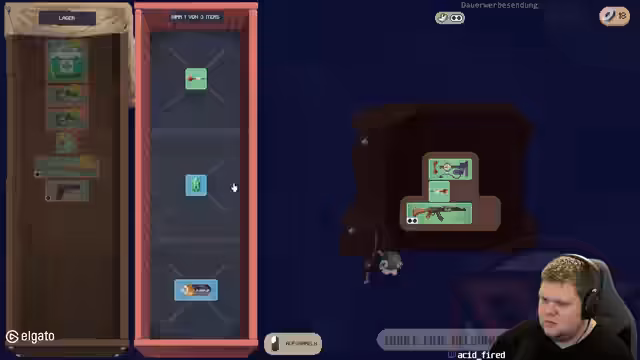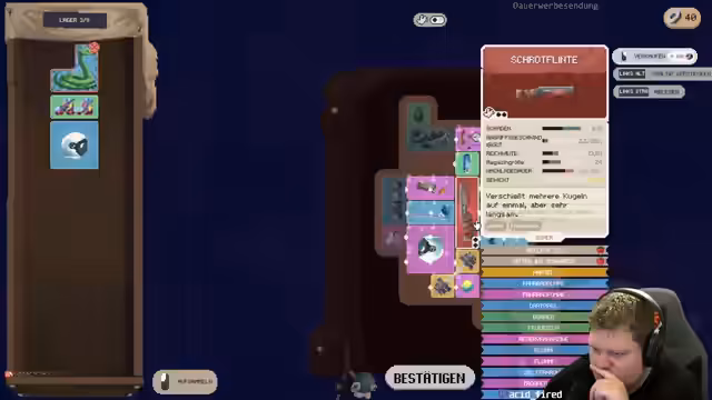 05:17:31Nach erfolgreichen Tarkov-Sessions wird der Fokus auf das Spiel 'Deadly Days Road Trip' gelegt. Das Spiel wird als eine Mischung aus 'Brotato' und 'Backpack Battles' beschrieben, bei der der Rucksack optimiert und gleichzeitig genügend Schaden verursacht werden muss. Die gameeigenen Mechaniken wie das Platzieren von Items und die Nutzung von Items mit Fernkampfwaffen werden getestet.
