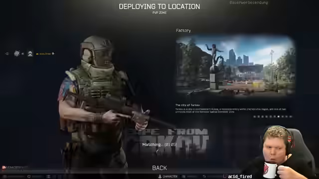 00:00:00Der Stream beginnt mit der Ankunft des Streamers in Escape from Tarkov auf seiner Bushaltestelle. Schon zu Beginn wird er aus dem Haus beschossen und muss sich heilen. Er erwähnt eine nervige Quest und strebt einen One-Shot Out-of-Steps-Achievement an. In einem folgenden Raid auf dem Map-Tag Hof wird er im BTR überrascht und eliminiert. Der Streamer diskutiert über die Performance von Tarkov und das Gameplay-Feeling, das sich durch Patches verändert hat.