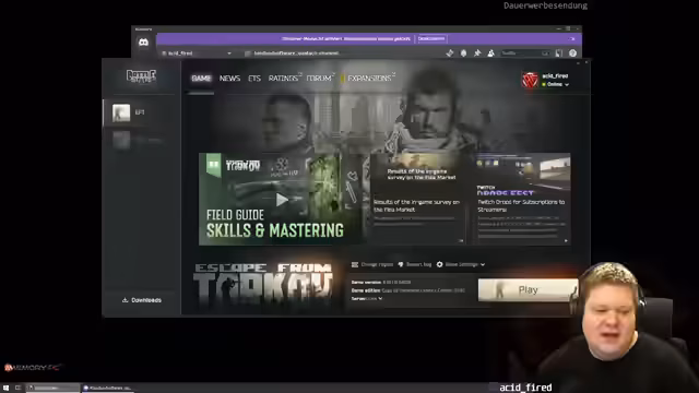 00:00:32Die Session beginnt mit intensiven Feuergefechten in Tarkov, wo die Reaktionszeiten und das Bewusstsein für die Umgebung entscheidend sind. Der Streamer betont die Notwendigkeit, jederzeit mit Beschuss zu rechnen und schnelle Entscheidungen zu treffen, insbesondere in Bezug auf das Nachladen von Waffen. Es wird eine humorvolle Auseinandersetzung mit anderen Spielern gezeigt, die in einer Kooperationsanfrage gipfelt, bevor sie abrupt endet. Der Fokus liegt auf dem Sammeln von Loot und dem Bewältigen unerwarteter Angriffe aus dem Hinterhalt, was die unberechenbare Natur des Spiels hervorhebt. Es wird die Schwierigkeit mit bestimmten Waffenmodellen, wie der MCX, angesprochen, die oft zu frustrierenden Situationen führen. Der Streamer spricht über die Notwendigkeit, bestimmte Gegenstände wie T-Pötte und Vasen für eine Aufgabe zu finden, wobei er humorvoll die wiederholte Suche nach diesen Artikeln betont. Es wird ein unerwarteter Tod durch eine Explosion thematisiert, was die gefährliche Umgebung in Tarkov unterstreicht.
