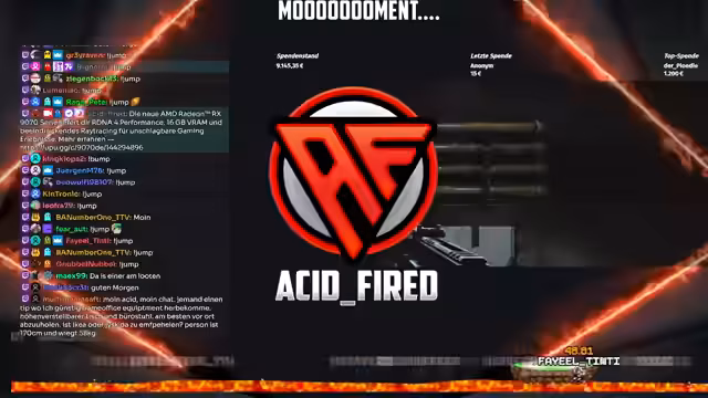 Bei acid_fired standen "Escape from Tarkov"-Action, die Ankündigung einer Partnerschaft mit Hitschies und eine Diskussion über Grafikkarten im Fokus. Es gab Empfehlungen für Büromöbel, Analysen von Spielverbesserungen und Gespräche über Maps. Questfortschritte und technische Hinweise rundeten das Programm ab.