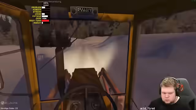 08:07:28Der Streamer widmet sich nun einem Überlebensszenario. Sein Team ist mit einem Fahrzeug im Schnee steckengeblieben und es geht darum, die knappen Ressourcen zu verwalten. Es herrscht akuter Mangel an Nahrung und Getränken. Die Lösung ist die Fahrt mit einem Traktor über einen See, um Vorräte einzukaufen. Währenddessen steigt sein Stresslevel, und er sucht nach Wegen, dieses zu reduzieren. Die Reise ist geprägt von logistischen Herausforderungen, wie dem unfallbedingten Bruch der Frontscheibe des Fahrzeugs und der Frage, wie die Reparatur am nächsten Tag erfolgen soll.