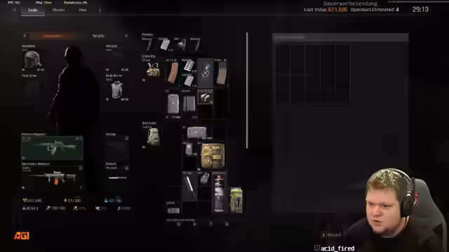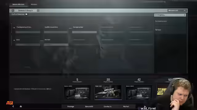 05:20:53Der Streamer erwähnt seine Taktik, Geld zu verdienen, indem er Runden auf der Farm-Map spielt, Loot sammelt und bei Bedarf den Raid resettet. Er möchte sich für größere Modi etwas Geld anlegen. Gleichzeitig hat er eine Quest, bei der er Ausrüstung in die kleine Halle der Farm bringen muss. Er ist sich unsicher, wie weit er in den Season-Missions bereits ist und ob er den richtigen Gegenstand dabei hat. Er plant, weitere Runden auf der Farm zu spielen, um seine Quests abzuschließen und Loot zu farmen.