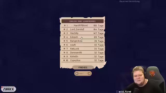 10:48:04Der Streamer stirbt schnell und erreicht keinen neuen Rekord. Es wird überlegt, ob der Reaper freigemacht wurde. Der Boss wurde erreicht und an derselben Stelle wie beim letzten Mal gestorben. Der Wackelmann wird kurz ausprobiert und das Geräusch der Sensorin gelobt. Es wird betont, dass dies nur ein Run ist und am Freitag richtig reingehustelt werden kann. Der Streamer möchte am Wochenende die Top Ten knacken und verhandelt möglicherweise mit seiner Frau, um so lange zu streamen, bis es soweit ist. Es wird das Angriffspattern des Speers bevorzugt, aber mit dem neuen Charakter in die Top Ten gebracht werden soll. Es wird ein Key-Giveaway geplant, um Zuschauern einen früheren Zugang zum Spiel zu ermöglichen.