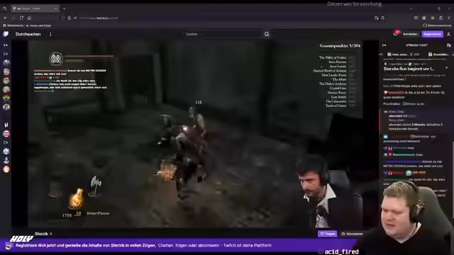 03:22:09Nachdem der Streamer eine Pause eingelegt hat, in der er von einem Food-Service spricht, wechselt er das Thema zu Dark Souls. Er startet das Spiel und erklärt, dass er die Remastered-Version nutzt. Er zeigt Schwierigkeiten bei der Anmeldung und muss den Steam-Browser aufrufen. Nachdem er erfolgreich eingeloggt ist, zeigt er den Chat und erwähnt, dass er einen Livestream eines anderen Spielers sieht. Er beschreibt seine erste Begegnung mit einem Gegner, den er als Asylum-Dämon bezeichnet, und erklärt, dass dieser sofort angreift. Der Streamer betont, dass er den Anfang des Spiels üben möchte, um Punkte zu sammeln und sein Spielverständnis zu verbessern. Er erwähnt, dass er einen Charakter namens Bandit spielt und mit verschiedenen Gegenständen experimentiert.