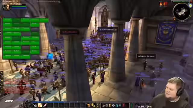 00:07:56Die Raid-Gruppen werden zusammengestellt und zum gemeinsamen RP-Walk (Rollenspiel-Laufen) Richtung Kathedrale aufgebrochen. Gleichzeitig beginnt eine intensive Diskussion über die Wahl von Allianz oder Horde. Streamer laden gezielt andere Content-Ersteller ein und betonen die Wichtigkeit der Fraktionswahl für das Event. Erste Todesfälle und technische Probleme (z. B. Layer-Hopping) treten auf, während die Gruppe Goldheim passiert.