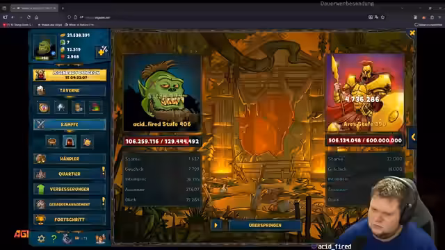 08:23:30Der Streamer vertieft sein Problem mit dem defekten Bürostuhl. Er beschreibt, dass ein Plastikteil der Mechanik kaputt ist und der Austausch des gesamten, tragenden Teils prohibitiv teuer wäre. Gleichzeitig berichtet er vom Fortschritt im 'Legendary Dungeon' von 'Shakes & Fidget', bei dem er durch das Leveln von Gegenständen und das Töten von Monstern an Stärke gewonnen hat. Er erwähnt, dass er den Dungeon heute möglicherweise nicht mehr schafft, aber morgen fortsetzen wird.