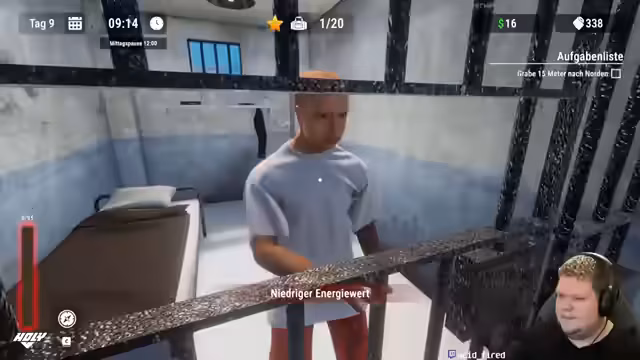 07:22:05Es beginnt der dritte Teil der Serie Prison Escape Simulator mit dem Hardcore Update. Es wird ein Neustart von OBS in Erwägung gezogen, um mögliche Asynchronität zu beheben. Es wird ein Auftrag von Big Jeremy angenommen, einen Schraubenschlüssel zu besorgen, und ein Kompass gekauft, um Norden zu lokalisieren. Es wird festgestellt, dass der Fluchtpunkt an der Außenseite des Gebäudes liegt. Es kommt zu einem Speicherstandproblem, bei dem der Fortschritt teilweise verloren gegangen ist, obwohl der Lagerraum bereits geöffnet war. Es wird spekuliert, dass der Boden nachgerutscht sein könnte oder das Safe Game kaputt ist. Trotzdem wird beschlossen, weiterzuspielen und sich wieder runterzubuddeln. Es werden Aufträge angenommen, Gegenstände verkauft und die Energie aufgestockt, um den Ausbruch voranzutreiben. Es wird überlegt, Dynamit einzusetzen, um den Tunnel voranzutreiben, aber der Einsatz zeigt keine Wirkung. Der Stream endet abrupt, als der Charakter in einen Schacht fällt und es zu dunkel ist, um weiterzuspielen, was zu einem Cliffhanger führt.