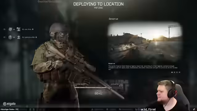 00:16:58Der Streamer startet eine neue Session auf der Map Streets. Er ist mit seinem Spawnpunkt zufrieden und erhält eine Greenflare, die er für gute PVP-Positionen nutzen möchte. Er überlegt, ob es sinnvoll ist, den Gegner im Spawn zu abcampen, aber riskiert stattdessen, Loot zu machen, um schnell wieder auszusteigen und nicht die Karte zu verlieren.