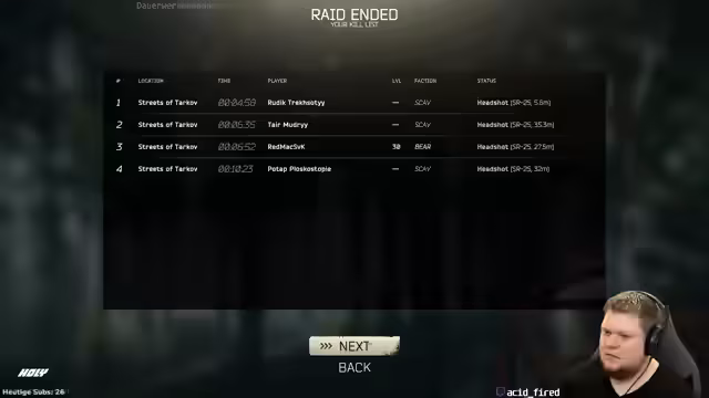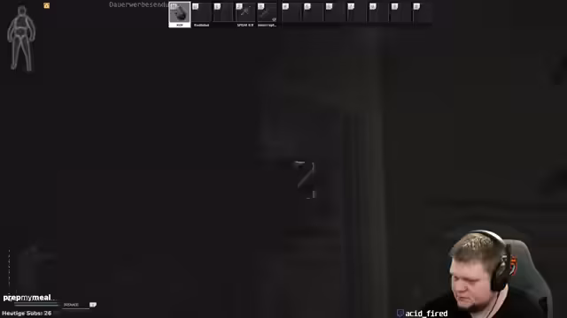 00:00:21Der Streamer beginnt eine Runde im Horror-Modus und stellt direkt fest, dass er von einem Spieler mit einem Grenadier gekillt wurde, weil er dessen Gegner war. Er ist verwirrt, da er den Gegner weder gehört noch gesehen hat und der plötzlich vor ihm stand. Ein weiterer Spieler stellt sich als Scav vor und der Streamer bekommt den Tipp, mit ihm zu extrahieren, was ihm auch gelingt. Er kommentiert den Tod als bescheuert, weil der Gegner offenbar ohne Schritte durch die Map gelaufen ist.