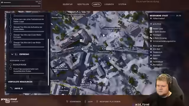 00:10:29Der Spieler berichtet von einem frühen Aufwachen und einer unruhigen Nacht, da er am Vortag auf dem Sofa eingeschlafen war und dann im Bett nicht mehr richtig schlafen konnte. Trotz der Müdigkeit ist er bereit für den Stream und stellt sich den täglichen Quests. Die aktuelle Aufgabe besteht darin, eine Espressomaschine in einem Café zu finden. Der Spieler äußert Unsicherheit über den genauen Standort des Cafés und beginnt, verschiedene Gebäude zu durchsuchen, darunter eine Bücherei, in der er bereits am Vortag erfolglos gesucht hatte. Die Suche nach der Espressomaschine gestaltet sich schwierig, da viele Orte bereits geplündert wurden oder nicht die gesuchten Gegenstände enthalten.